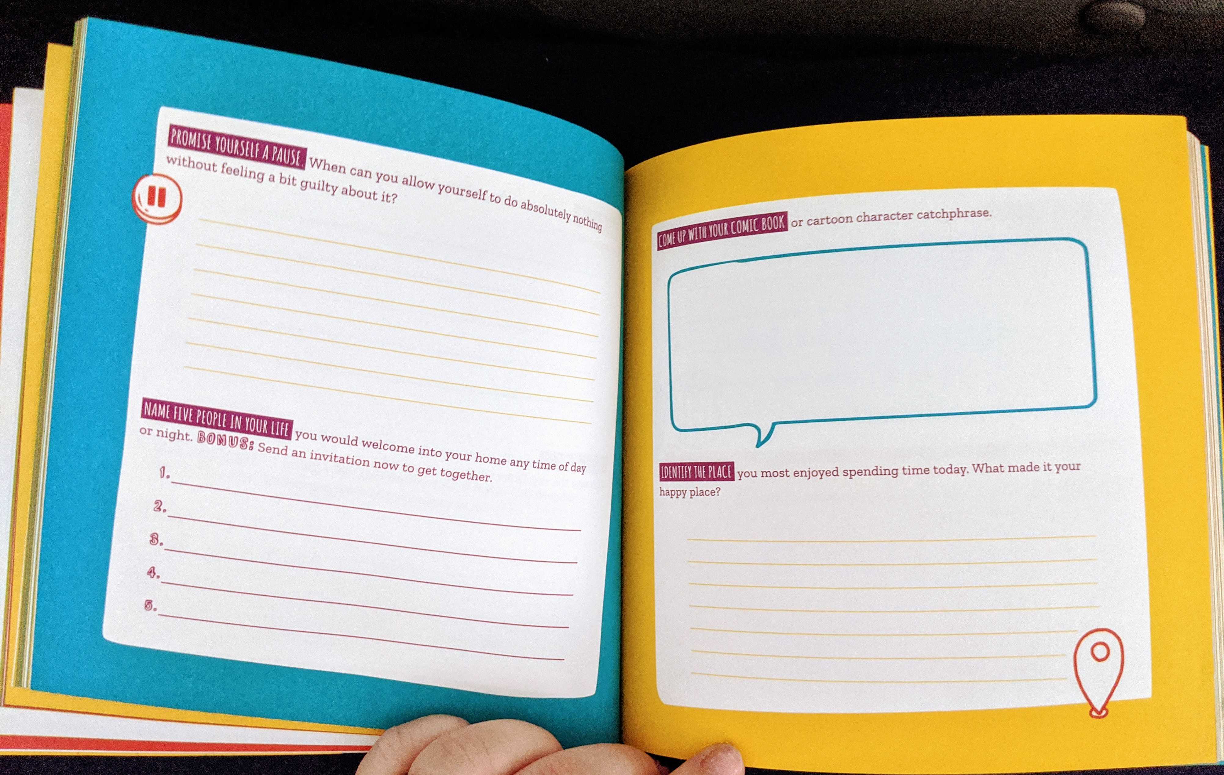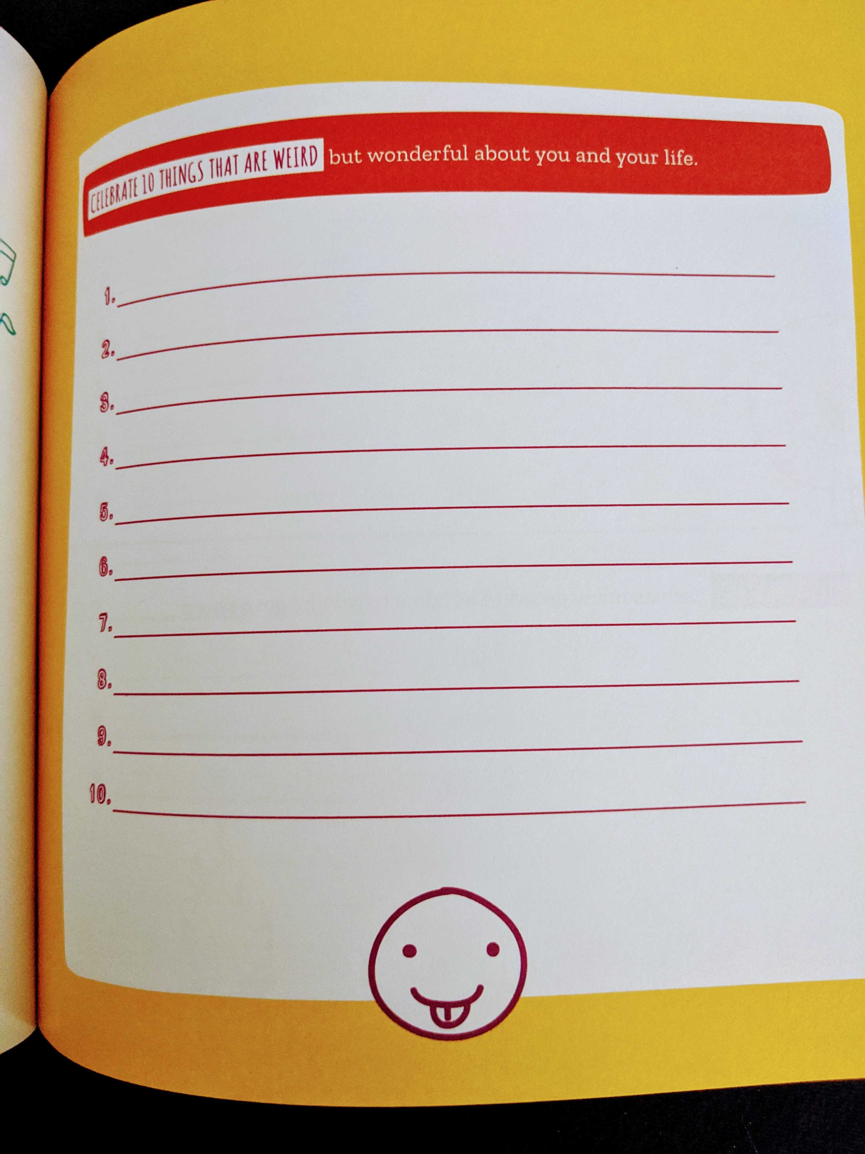 This quote is on the very first page of the book and it hit me hard. How often do we try and find or create the most extraordinary moments in life in order to be happy? Have you ever just looked around and found joy in something small and seemingly insignificant? Happiness is there if we just take a step back and really look. The very first prompt in this book says, ” Write down a song lyric that is guaranteed to make you smile whenever you hear it. BONUS: Make that song a ringtone.”